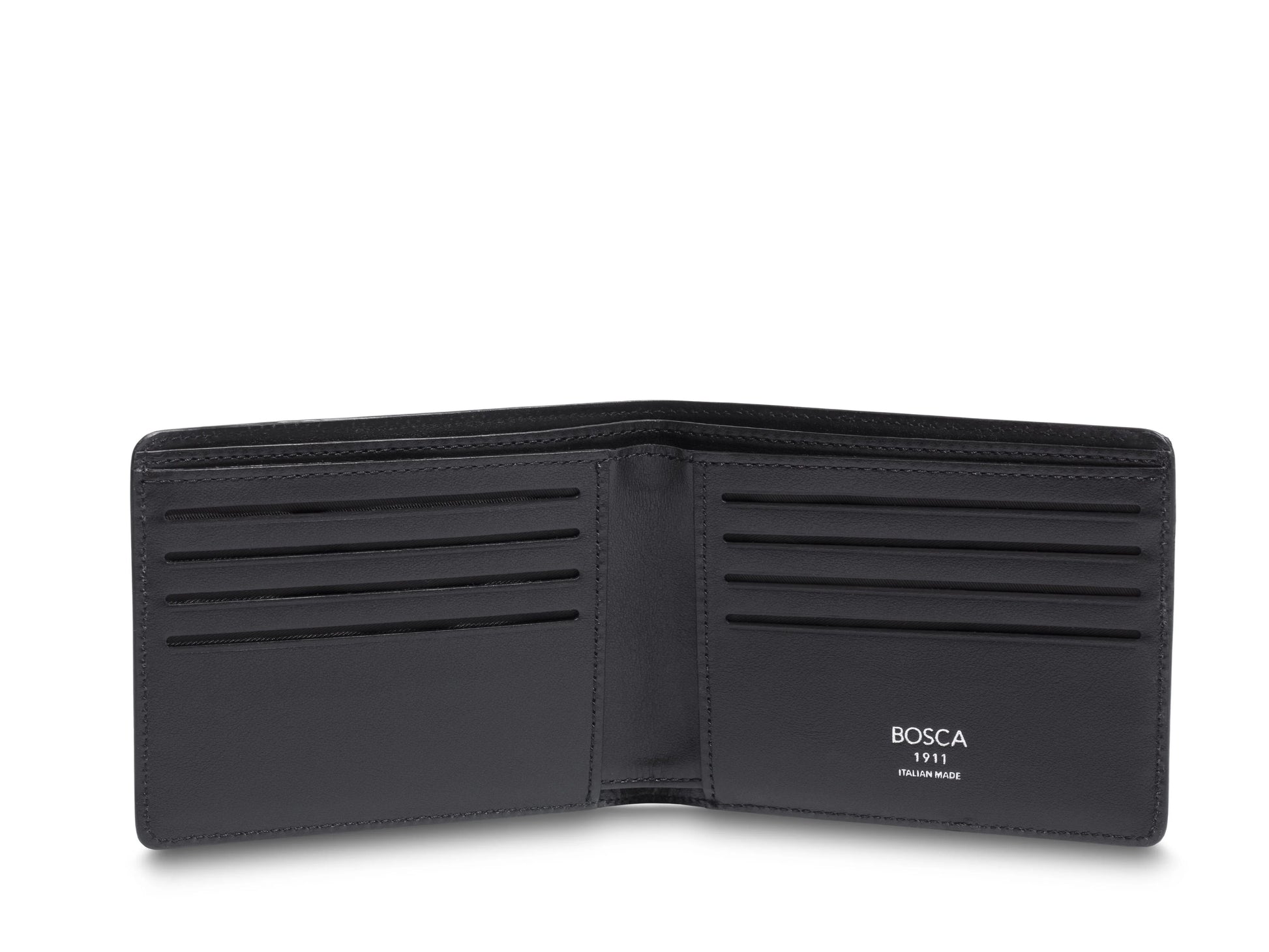 The slot pocket construction reduces excess layers of material, allowing the wallet to remain remarkably thin while still offering generous storage. Crafted in Italy at the Bosca Italia factory outside Florence, this wallet reflects generations of leather making expertise.