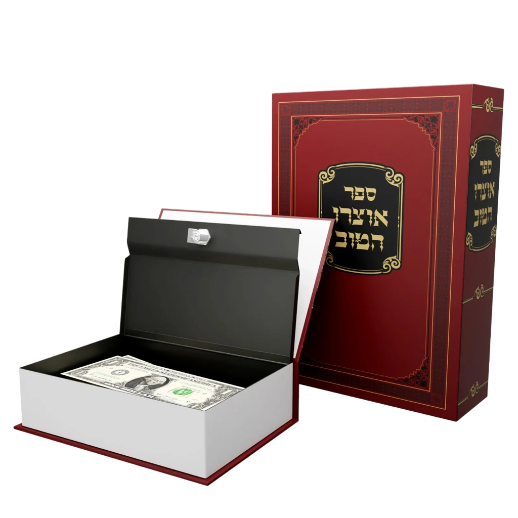 Keep your valuables secure in plain sight with the Sefer Oitzer Hatov Book Safe. Crafted to look exactly like a traditional Hebrew sefer, this clever safe features a rich maroon hardcover and authentic-looking spine text, making it indistinguishable on your bookshelf.