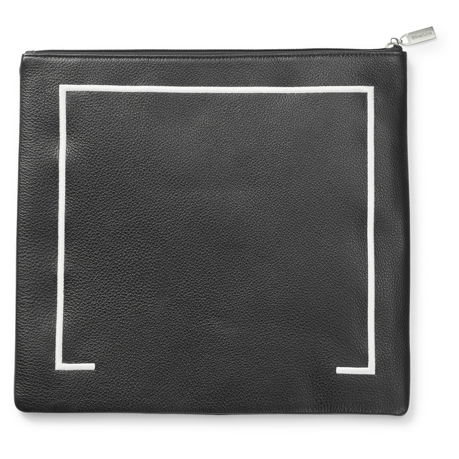 The Orvieto Tallis Bag features a structured embroidered border with subtle offset detailing, creating a refined yet distinctive look. The contrast of black and white enhances the design, giving it a sharp, contemporary presence while maintaining a sense of balance and sophistication.