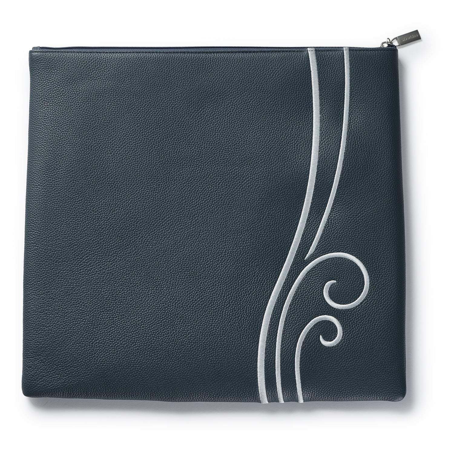 The Ravello Tallis Bag features flowing embroidered curves that create a sense of motion and refinement. The crisp white detailing sweeps along the side in a graceful pattern, bringing a clean and modern contrast to the rich navy base.