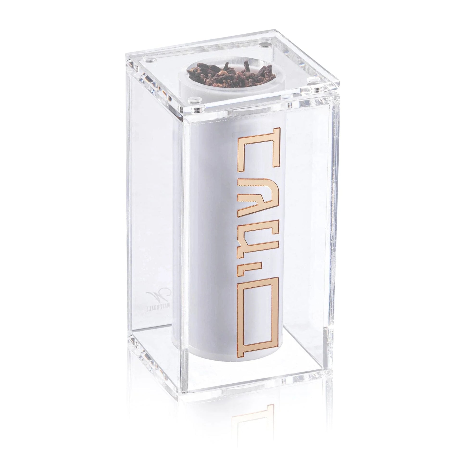 Elevate your Havdalah ritual with this exquisite luxe Lucite Besamim Holder. Crafted from thick, clear lucite and featuring elegantly printed white lettering, it combines durability with refined aesthetics. The white lucite magnetic cover ensures secure storage while adding a sleek touch. Practical yet visually stunning, this Besamim holder is an ideal gift and pairs beautifully with the matching Match holder for a coordinated table setting.